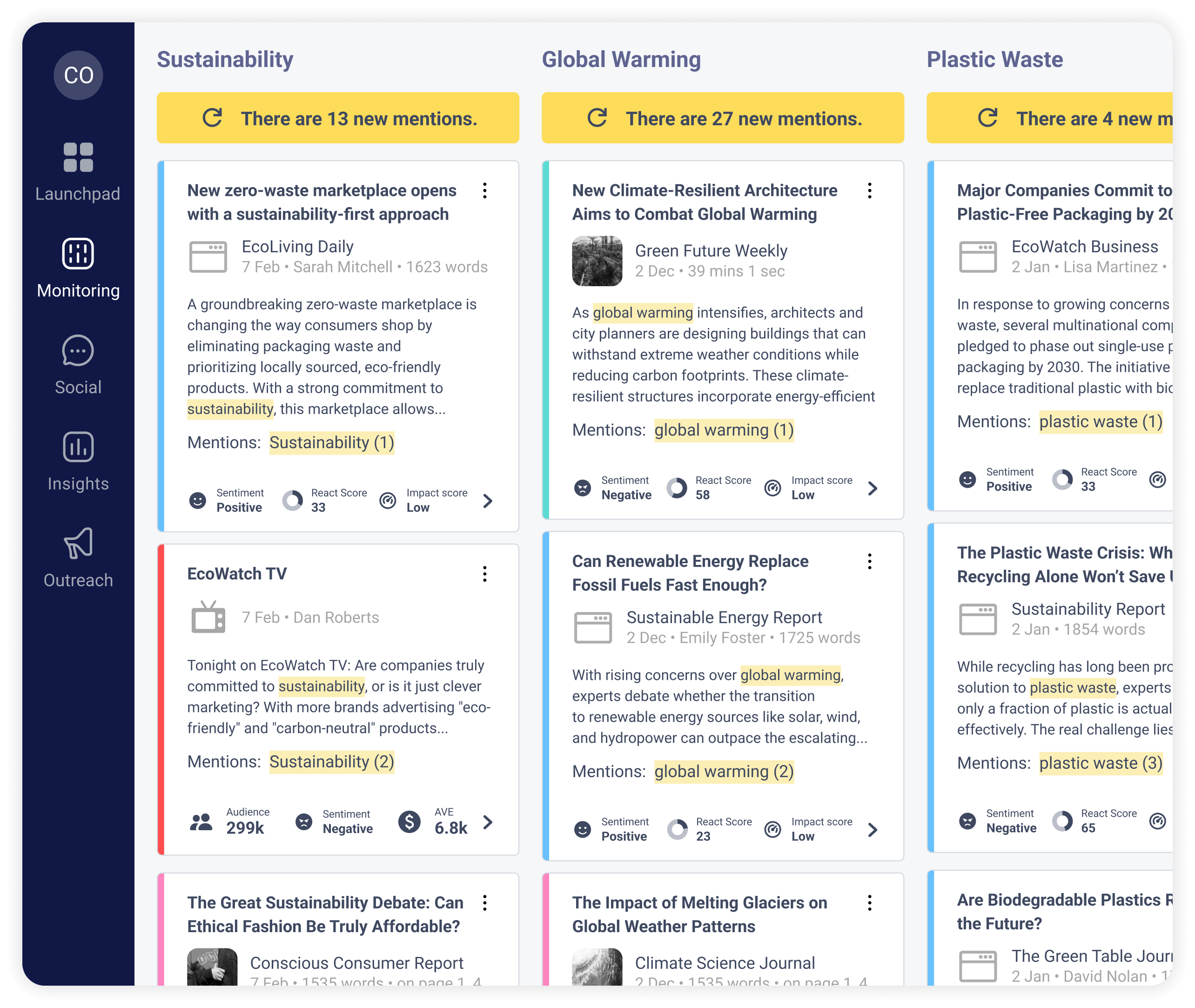Mit CisionOne Medienbeobachtung verpassen Sie keine relevante Erwähnung Ihrer Marke, Ihrer Wettbewerber oder Ihrer Branche mehr – weltweit und in Echtzeit.